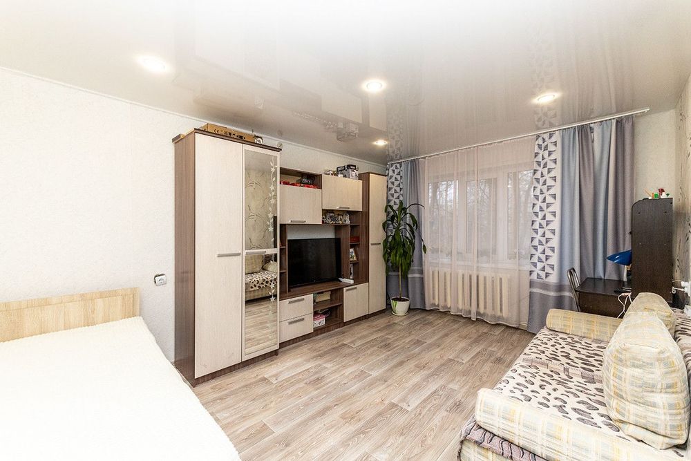 Состояние квартиры хорошее. Стеклопакеты, в комнате на полу ламинат, натяжной потолок. В ванной комнате плитка, заменены трубы, установлены счетчики на воду.