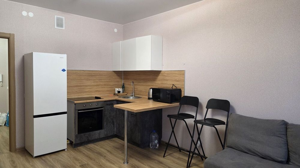 - Квартира оборудована всем необходимым для жизни: кухонный гарнитур, варочная поверхностью, духовой шкаф, новая микроволновая печь, холодильник, чайник, новая стиральная машина