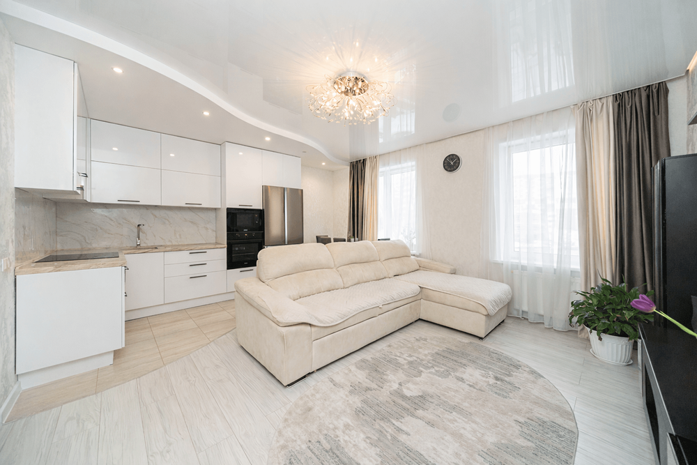 - Просторная гостиная-кухня выполнена в стиле минимализма, имеет удобную геометрию для оптимальной расстановки мебели и техники. Оставшийся вам гарнитур оснащен современной встраиваемой бытовой техникой высокого класса: вытяжкой, мощной варочной поверхностью, духовкой, холодильником и каменной столешницей.